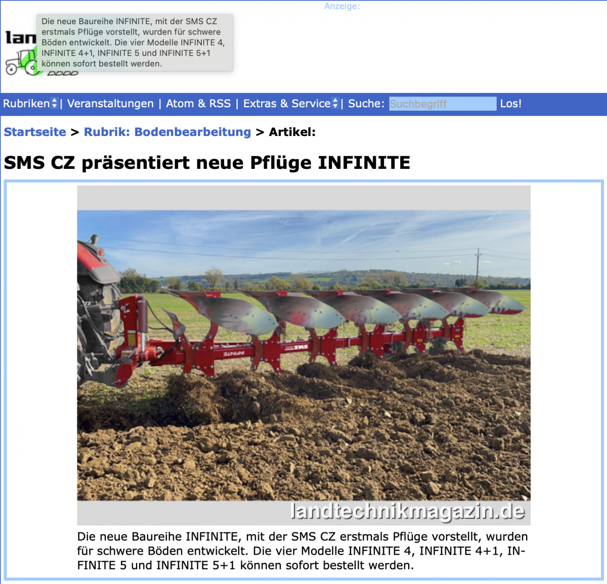 SMS CZ präsentiert neue Pflüge INFINITE (Landtechnik magazin, DE, 15. 7. 2024)