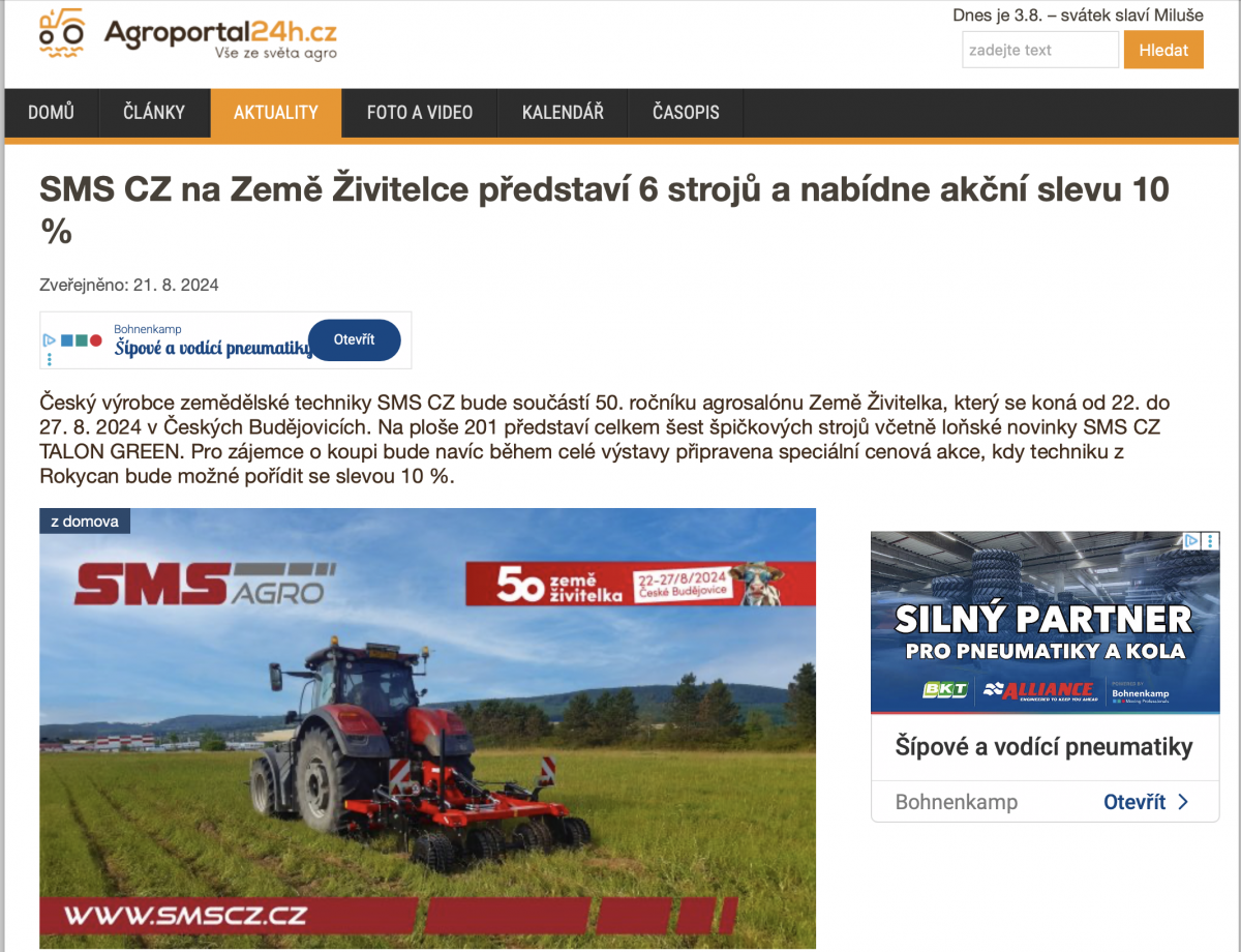 SMS CZ na Země Živitelce představí 6 strojů a nabídne akční slevu 10 % (Agroportal24h.cz, CZE, 21. 8. 2024)
