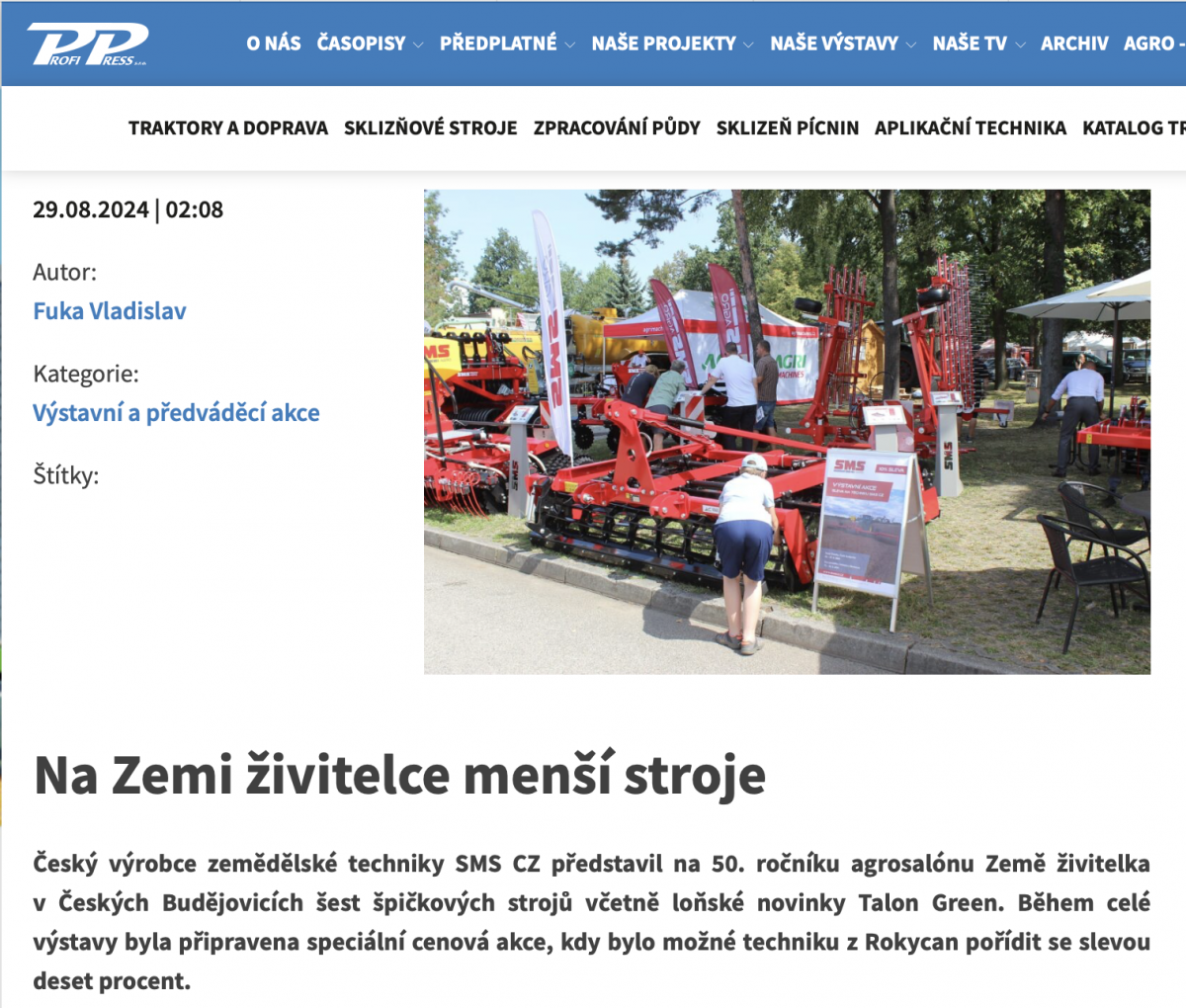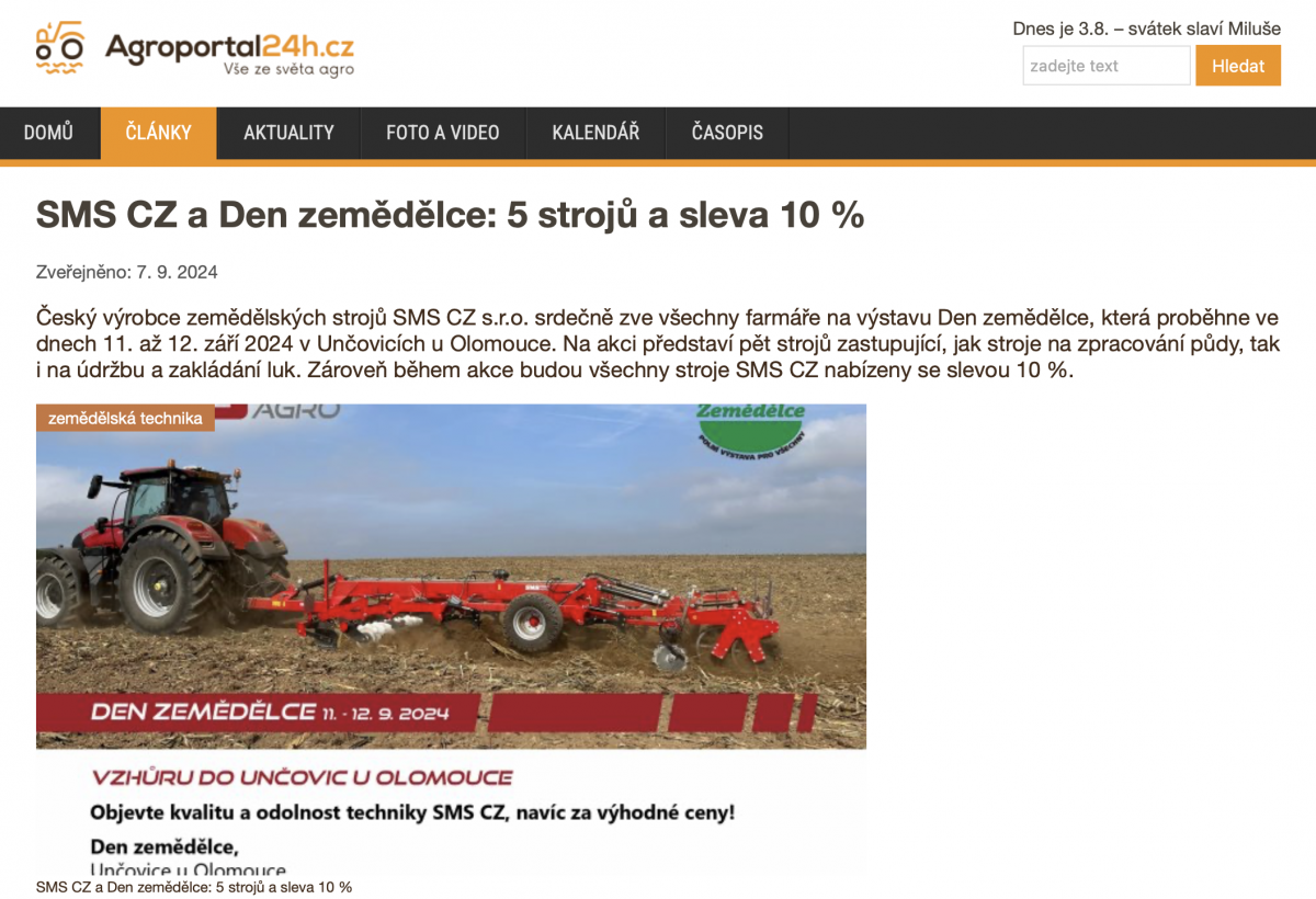 SMS CZ a Den zemědělce: 5 strojů a sleva 10 % (Agroportal24h.cz, CZ, 7. 9. 2024)