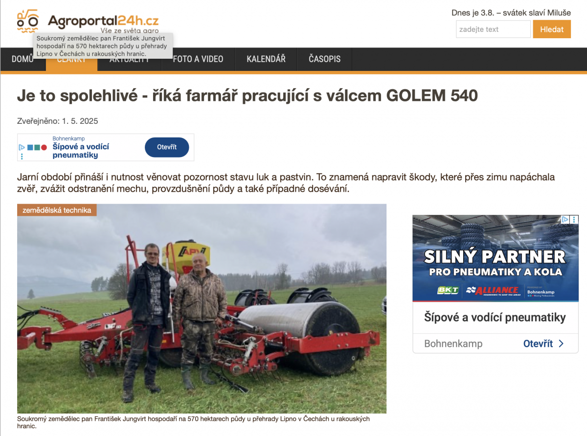 Je to spolehlivé ‒ říká farmář pracující s válcem GOLEM 540 (Agroportal24h.cz, CZ, 1. 5. 2025)