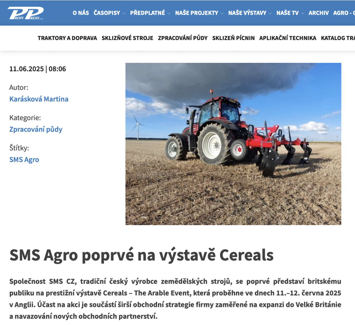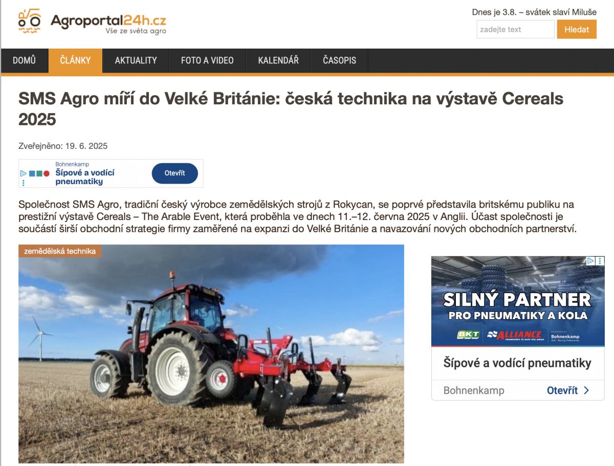 SMS Agro míří do Velké Británie: česká technika na výstavě Cereals 2025 (Agroportal24h.cz, CZ, 19. 6. 2025)