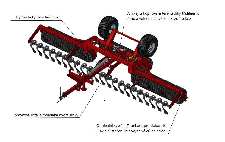 Stroj je rozdělen do tří pracovních sekcí, které jsou nezávisle uchyceny na rámu. Díky tomu má Titan Simple vynikající kopírovací schopnosti, protože každá sekce se může volně vychylovat i do záporných úhlů. Skládání do pracovní nebo transportní polohy je řešeno hydraulicky. Díky hydraulickým okruhům je práce se strojem velmi komfortní a obsluha může z kabiny traktoru ovládat nejen rozkládání stroje, ale také zapínání a vypínání smyku.