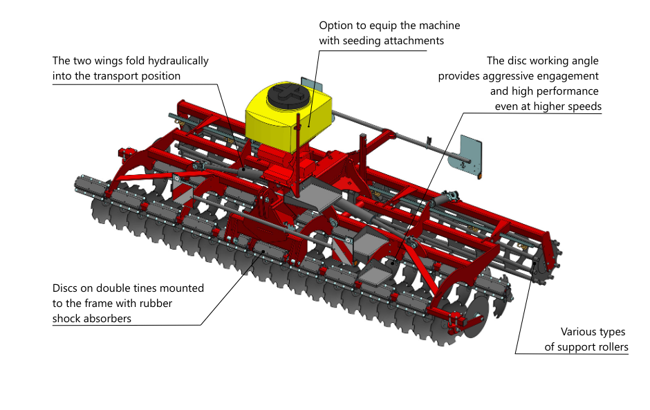 The machine is suitable for shallow cultivation down to 12 cm, intensive mixing of organic matter, and seedbed preparation. Customers can choose discs with a diameter of 510 mm (standard) or 560 mm (optional) and a wide range of support rollers and additional equipment, including seeding attachments. Hydraulic working depth adjustment allows simple and quick adaptation to working conditions.